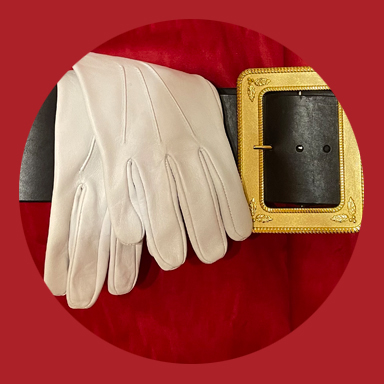 Unser Kostüm wurde individuell für uns genäht. Die hierfür genutzten Schnittmuster stammen aus den USA und wurden in den 1950er Jahren gedruckt. Die vergoldeten Knöpfe und der Echtledergürtel mit der ebenfalls vergoldeten Gürtelschnalle stammen ebenfalls aus den USA.