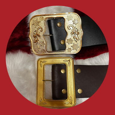 Der breite und dicke Gürtel ist aus echtem Leder mit einer 24-Karat-vergoldeten Schnalle mit Weihnachtsmotiven. Die Gürtelschnalle ist selbstverständlich aus Metall und nicht aus Kunststoff.