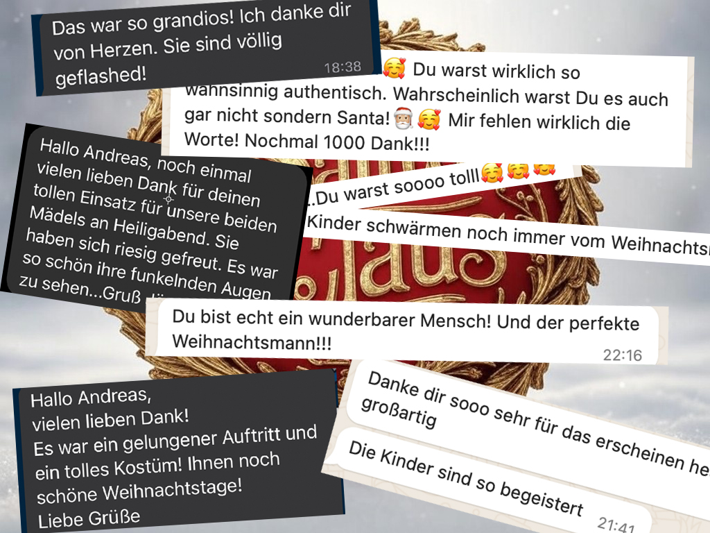 Unser Santa Claus wird pünktlich (+/- 15 Minuten) bei euch sein und für ein besonderes Fest sorgen.